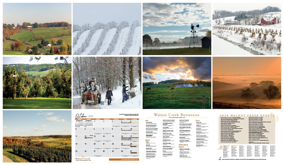 This new 2026 calendar features photography of Walnut Creek, OH. These are all all local photographs from various local photographers. There is also an extensive listing of Walnut Creek businesses, churches, services, and events. This is a great way to learn about and support your community.
